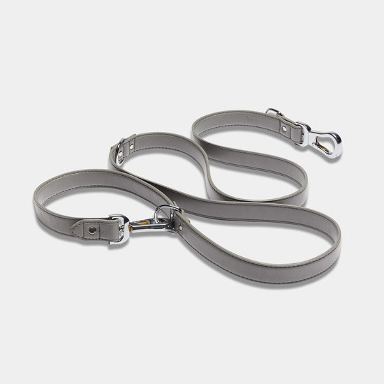 • Ash Grey Double Ended Dog Lead in Quality Vegan Leather. Silver Clips, D Rings & Buckles.