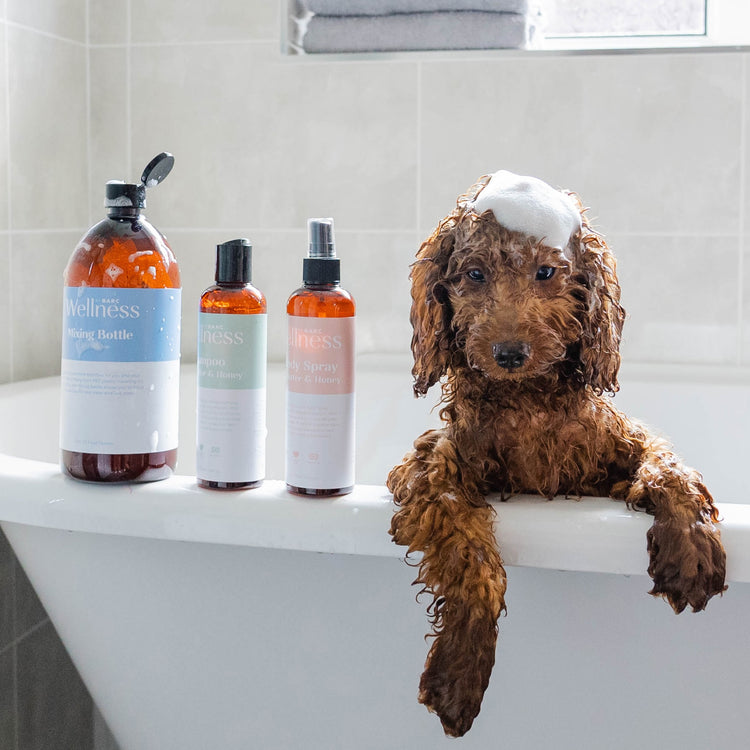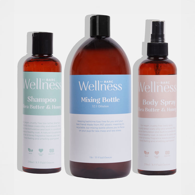 Our Wellness bundle includes three dog grooming essentials: 250ml shampoo 250ml body spray 1L capacity mixing bottle...